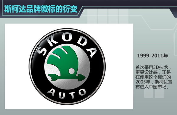 1999—2011:首次采用3D设计,显得更加立体和具有设计感。正是在使用这一品牌标识的2005年,斯柯达汽车正式开启了中国之路。