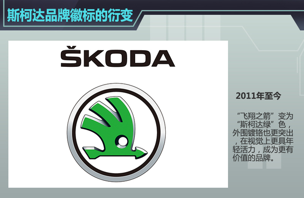 2011年至今:在2011日内瓦车展上,大众旗下斯柯达品牌正式发布新的品牌标志。此次车标最大的改变在于飞翔之箭,在新的设计中它更大更明显。飞翔之箭的颜色由“自然绿”变为了全新的更葱郁的“斯柯达绿”,外围区域的镀铬效果也更加突出,增加了科技感。随着形象特征的衍变,斯柯达品牌LOGO在视觉上更具年轻活力。(网通社2015年7月27日北京报道)