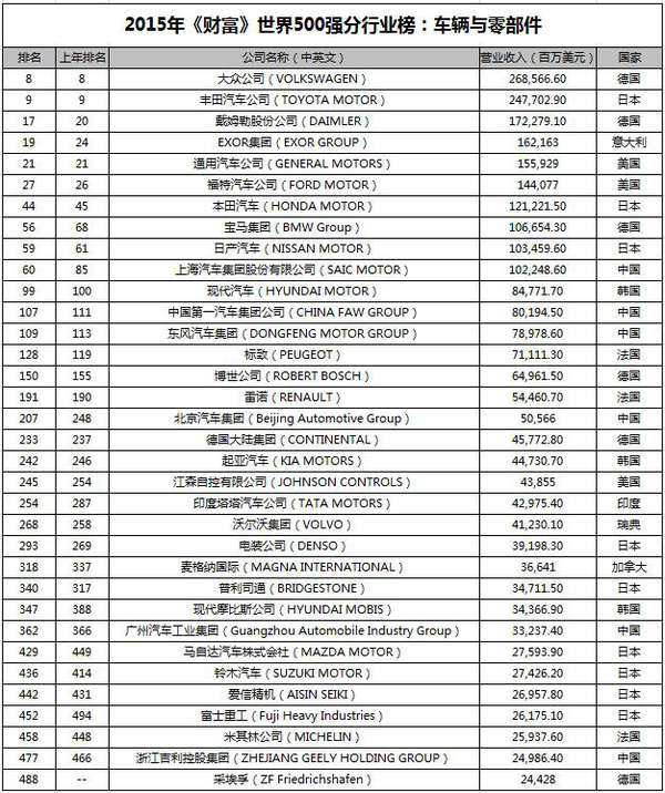 图1:《2015年财富世界500强分行业榜:车辆与零部件》全球企业排名