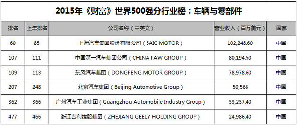 图2:《2015年财富世界500强分行业榜:车辆与零部件》国内企业排名
