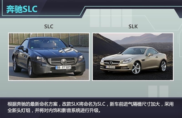 根据奔驰不久前公布的最新命名方案,改款SLK将命名为SLC。从谍照来看,SLC依旧延续了SLK的整体风格,仅在现款SLK的基础上进行了小幅升级。SLC的前脸采用奔驰家族最新的设计风格,前进气隔栅尺寸加大,采用全新头灯组,使前脸极具冲击力。车尾短小紧凑,配有双侧单出尾排。新车将保留双座布局,并对内饰和影音系统进行升级。
