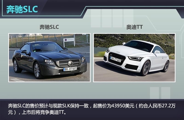 新SLC将衍生出3款车型,包括一款经调校的AMG顶配版。该性能车现款搭载5.5升V8发动机,新款将使用排量更小的4.0升V8双涡轮发动机。现款奔驰SLK入门级车型SLK 250售价为43950美元(约合人民币27.2万元),高端版车型SLK55 AMG售价为70900美元(约合人民币44万元),全新SLC售价可能与现款售价持平。