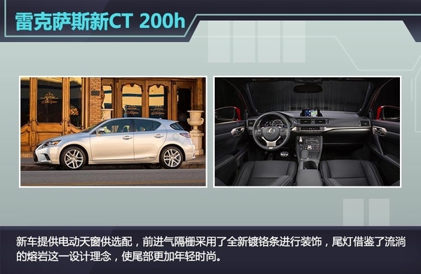 从官图来看,2016款雷克萨斯CT 200h在原有车型的基础上进行了换新,既保留了家族特色又融入了最新元素,提供电动天窗供选配。新车的前进气隔栅改动较大,采用了全新镀铬条进行装饰;尾部基本保留了原有风格,但借鉴了流淌的熔岩这一设计理念的尾灯使尾部更加年轻时尚,充满运动气息。