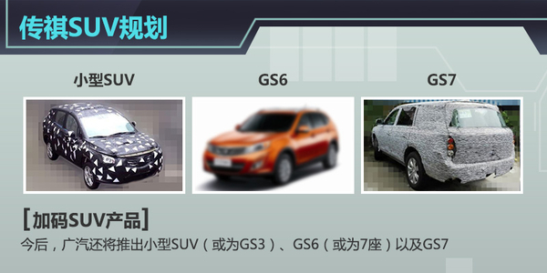 除了轿车,传祺还将加速布局SUV产品。“今年,国内整个车市增长非常缓慢,但是SUV今年上半年增长52%。适当地发展SUV,我看还是有必要的。”广汽集团执行董事、广汽乘用车董事总经理吴松表示。明年,传祺还会推出中型SUV——GS6以及一款更高端的GS7车型。而在2017年还将推出一款小型SUV以完善SUV产品布局。(网通社2015年7月28日北京报道)