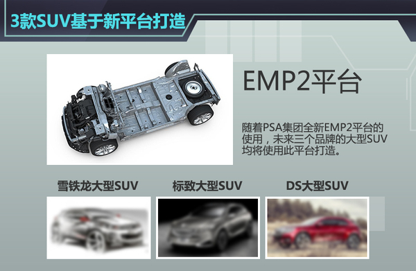 标致雪铁龙集团近两年来一直在SUV领域不断发力,旗下标致、雪铁龙、DS三大品牌纷纷在中国市场推出相应的车型。而在全新EMP2平台推出后,三大品牌将基于此平台推出更多SUV产品。近日,网通社汇总了PSA集团的产品规划,标致、雪铁龙、DS品牌均将推出中型SUV车型,三款新车将基于全新EMP2平台打造并均有计划在华投产,可以说上述车型的推出将弥补PSA集团在大型SUV领域的空白。