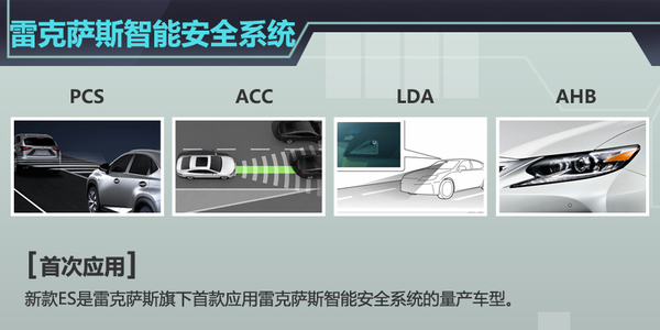 新款ES是雷克萨斯旗下首款应用雷克萨斯智能安全系统的量产车型。该系统整合了预碰撞安全系统(PCS)、自适应巡航控制系统(ACC)、车道偏离警示系统(LDA)和远光灯自动控制系统(AHB)四大主动安全装置,大大提升了对驾乘者及第三方行人车辆的保护。