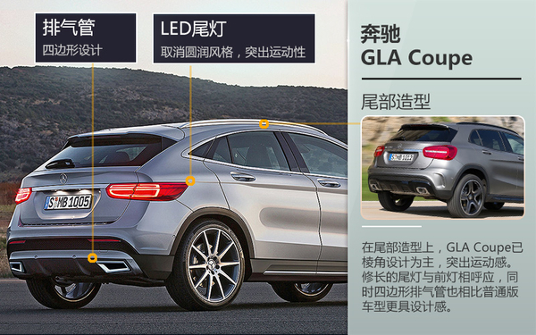 在外观方面,GLA Coupe整体造型更为动感。全新设计的头灯并未采用现有奔驰家族较为圆滑的设计,而是突出线条感。另外包括前进气格栅和前保险杠的造型均应用了硬朗的设计风格,棱角分明。尾部造型上,同样更为修长的尾灯与头灯相呼应,同时新设计的四边形排气管增加了尾部造型的立体感。