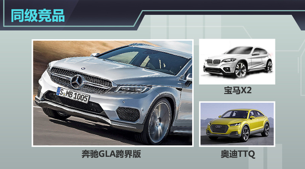 GLA跨界版作为一款定位在紧凑型跨界SUV市场的产品,虽目前市场上并未有同级车型推出,不过宝马和奥迪两大竞争对手也分别公布该级别市场中的车型规划,其中宝马X2已发布了设计图,整车在保持宝马一贯设计风格的同时更为突出了运动性能。而奥迪在此前则发布了TTQ概念SUV,该款产品基于全新一代TT的设计思路而来。(网通社2015年7月27日北京报道)