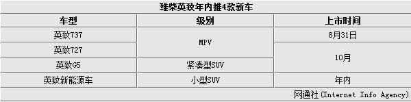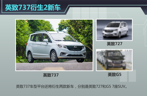 此外英致737车型平台还将衍生两款新车,分别是英致727和G5 7座SUV,英致727定位及售价都将低于737,面向偏商用车需求的城乡用户,预计10月份上市;G5 7座SUV将与英致737保持相似的内饰设计及相同的动力总成,但在外观方面将采用全新设计,计划将于10月份正式上市。