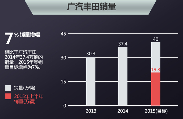 广汽丰田近年来销量呈稳步增长的态势,2013年累计销量30.3万台,2014年则达到37.4万台,增幅达到23.4%。2015年广汽丰田全年销售目标为40万台,截至今年六月已累计销售19.8万台,超额完成半年销售目标,其中B级轿车凯美瑞以6.6万辆的成绩当之无愧的成为广汽丰田旗下主力车型。如果未来凯美瑞可以搭载2.0T增压发动机,其产品竞争力将得到进一步提升,将为广汽丰田的销量增长做出更大的贡献。(网通社2015年7月29日北京报道)