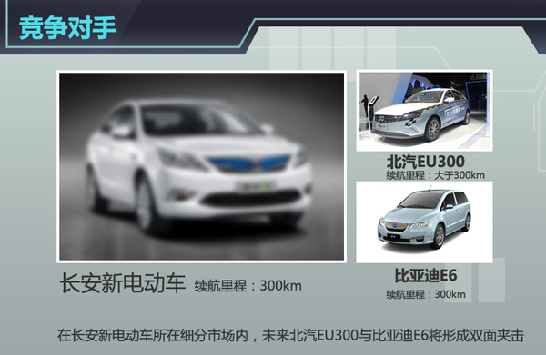 在国内新能源领域,北汽集团处于行业领头羊位置,其在2015年上海车展亮相的EU300综合续航里程将突破300km,该车有望于9月正式上市,先行长安一步。而在新能源市场摸爬滚打多年的比亚迪旗下车型E6早已在出租车行业试水,续航里程同样不弱于300km,待长安纯电动新车上市后,首先就要面对北汽EU300和比亚迪E6的双面夹击。