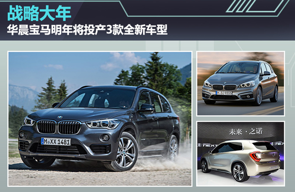 宝马在2014年7月就曾宣布与华晨汽车的合资协议将延长至2028年,基于此,宝马公布了一系列战略规划。其中产品线方面,在接下来的数年间,华晨宝马旗下现有的3款国产车型将增至6款。根据此前公布的消息,新增加的3款产品将分别是:一款小于宝马3系的全新入门级轿车;一款极富功能性的车型,这款车兼备实用性和典型宝马驾驶动感;还有一款将是专为中国设计的宝马X3车型。