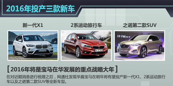由于中国汽车市场整体增长放缓,多家车企上半年销量仅呈现出微增长的情况,宝马便是其中之一。根据宝马官方向网通社提供的数据显示,2015年上半年,宝马集团在华共销售了超过23万辆新车,相比去年同比增长2.5%。日前,网通社从华晨宝马内部人士了解到,与2015年相比,2016年将是宝马在华发展的重点战略大年,届时宝马将有多款重磅新车推向中国市场。根据此前宝马在华发布的产品战略,华晨宝马从2016年起年将有望投产新一代X1、2系运动旅行车以及之诺第二款SUV等全新车型。