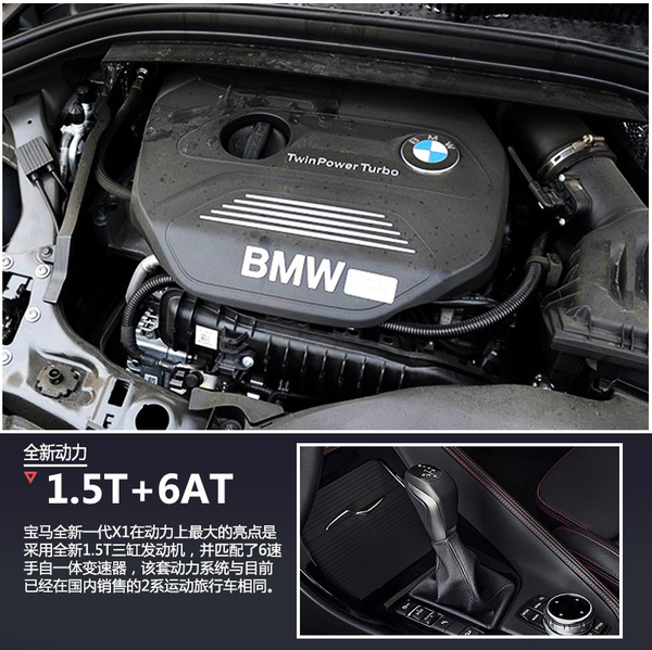 动力方面,宝马全新一代X1有了明显的变化,其中最大的亮点莫过于全新1.5T三缸涡轮增压小排量发动机的应用。目前这款全新发动机已在2系运动旅行等车型上有所应用,最大功率100kW,最大扭矩则为220Nm,并将命名为sDrive18i,相比现款搭载2.0T低功率发动机的sDrive18i车型而言,动力参数有所降低,同时变速器也将由原有的8速手自一体变速器变为6速手自一体变速器,不过小排量引擎的应用将为其带来更好的燃油经济性。