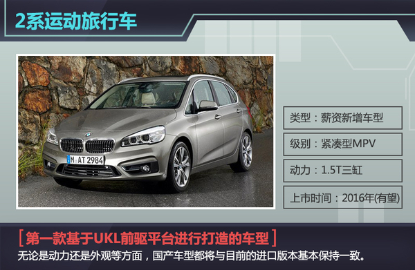 据了解,在新增的3款国产车型当中最早与消费者见面的将是有望在明年投放市场的兼备实用性和典型宝马驾驶动感的多功能车。通过宝马官方对这款车的描述猜测,该车即为目前以进口形式引入的宝马2系运动旅行车。除此之外,在2016年宝马还将有望推出此前已在海外正式发布的全新一代X1,以及合资自主品牌之诺旗下的第二款SUV车型。