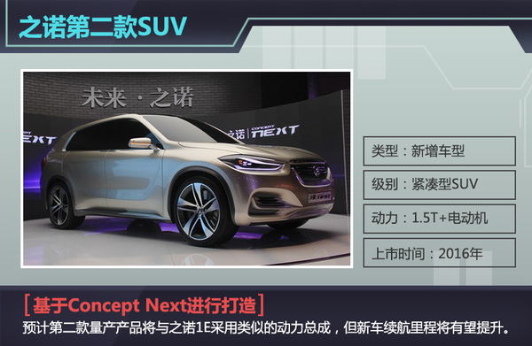 在今年的上海车展期间,之诺品牌发布了全新的概念车Concept Next,该车展示了之诺未来产品的最新设计理念。将于明年投产的之诺第二款SUV即为基于Concept Next进行打造的量产车型。华晨宝马之诺的第一款产品是基于宝马X1打造的电动SUV 1E,由三块磷酸铁铝电池与一台电动机作为其提供动力,官方公布的续航历程为150公里。预计第二款量产产品将与之诺1E采用类似的动力总成,但新车在续航里程方面将有望进行提升。(网通社2015年7月30日北京报道)
