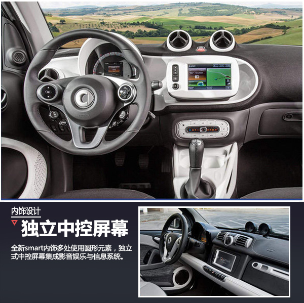 全新一代smart继承了smart车型的经典元素,丰富的车身配色和全新的外观设计却让其看起来既时尚同时又充满了力量。该车借鉴了smart fourjoy概念车的设计理念,车头设计更加方正、饱满,蜂窝状的前格栅很有辨识度。动力方面全新smart依然采用了1.0L发动机。