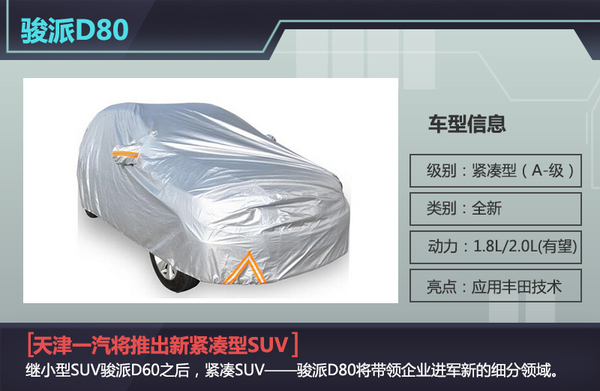 去年10月底,天津一汽旗下小型SUV骏派D60正式上市,标志着企业正式进军国内日趋火热的SUV市场。得益于该车的良好市场表现,2015年上半年天津一汽累计销售汽车3.77万台,扭转了从2011年开始的连续三年大幅下滑的局面,并在逐步企稳回升。接下来,天津一汽还将继续丰富产品阵容向更出色的市场表现发起冲击。天津一汽汽车销售有限公司副总经理党仁表示,除了骏派D60,天津一汽还将推出定位更高的骏派D80。据悉,该车有望应用其“近亲”丰田的诸多技术打造。