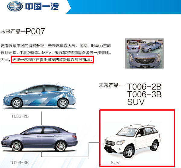 面对国内增速迅猛的SUV市场,天津一汽已做出相应的新车规划,继小型SUV骏派D60之后,紧凑SUV——骏派D80将带领企业进军新的细分领域。此前来自天津一汽的内部资料也显示了在未来天津一汽SUV产品序列中包含代号为T006-2B和T006-3B的两款SUV产品。
