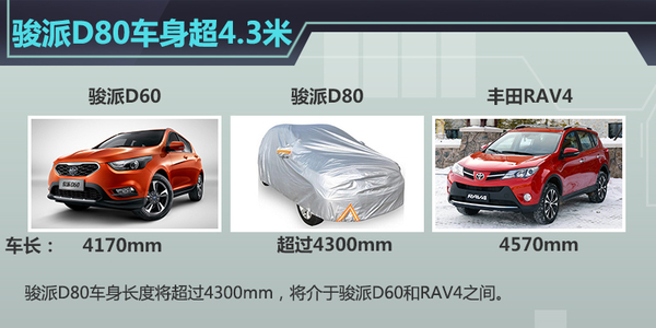 天津一汽内部人士此前向网通社透露,这款紧凑SUV将采用丰田MC平台打造。出色的车身尺寸将有利于车内空间的进一步优化,以获得更宽敞的驾乘空间,满足国内消费者在舒适度方面的需求。据悉,骏派D80车身长度将超过4.3米。作为参照,骏派D60车身长度为4.17米,丰田RAV4车身长度则为4.57米。骏派D80车身尺寸将拥有足够的竞争力。