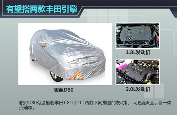 鉴于天津一汽与丰田的近亲关系,在天津一汽旗下产品应用丰田技术早已不是新鲜事,此前骏派D60搭载了来自丰田的原装1.8L自然吸气发动机。通过全新的平台打造,骏派D80紧凑SUV在动力系统上也将有所提升。据悉,这款SUV有望搭载丰田1.8L和2.0L两款不同排量的发动机,可匹配来自爱信6速手自一体变速箱。这些动力组合未来也有望在天津一汽的其他产品中普及。