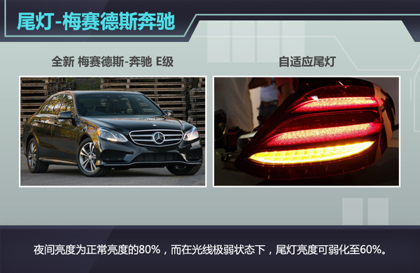 梅赛德斯奔驰全新E级所搭载的全新尾灯不仅造型更为动感,在实用性方面做出了革命性的提升。全新设计的尾灯能够根据环境不同自行调节亮度。正常状态下,尾灯亮度可达100%,而车辆在夜间行驶时可将亮度弱化至80%,若在昏暗环境下开启尾灯,其亮度最低可削弱至60%。