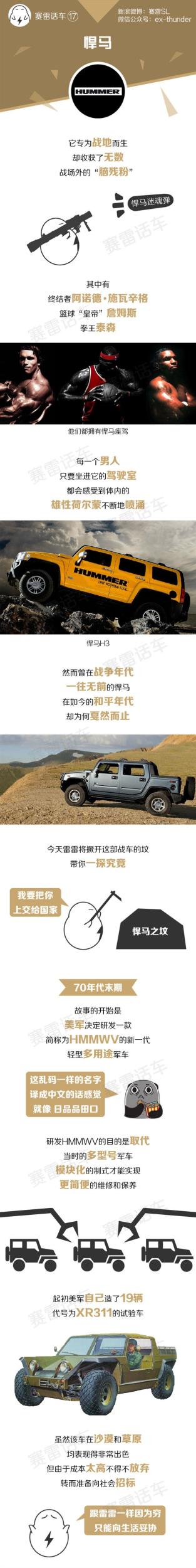 要说土豪劲能压制路虎的,估计也就只有悍马了,更加粗犷的造型,更大的排量,更铁血的背景,悍马在诸多战场上驰骋之后进入公众的视野却又转瞬消失,但悍马的故事依旧值得我们好好回味。