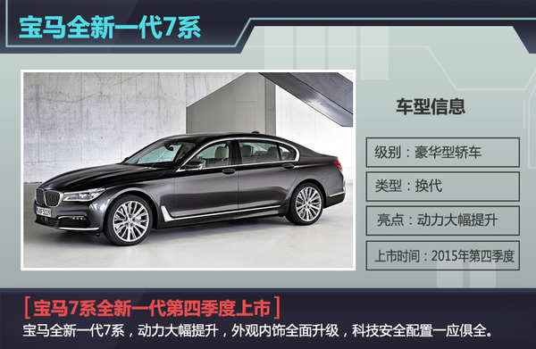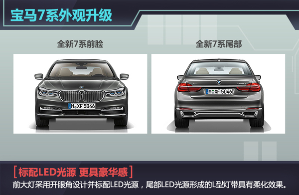 宝马7系定位于豪华型轿车,此次的新车将是7系的全新换代车型,预计于2015年第四季度正式上市,其整体轮廓变化并不是很大,线条设计采用家族式的设计语言。新车任然配备标志性的双肾进气格栅,而前大灯采用开眼角设计并标配LED光源。其尾部依然是标准的宝马风格,多出横向线条在视觉上造成新车更宽更大更豪华的感觉。经过重新设计的尾灯不论是时尚感还是年轻化都十分成功,LED光源形成的L型灯带带有柔化效果。
