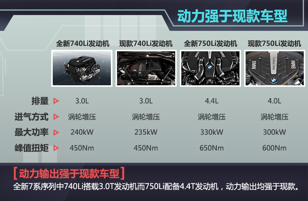 全新7系产品序列中,740Li搭载的B58B30发动机可输出240kW的最大功率,而现款740Li所搭载N55B30A最大功率为235kW、峰值扭矩450Nm;而全新750Li配备4.4T的V8涡轮增压发动机,最大功率为330kW、峰值扭矩650Nm,相比现款750Li的300kW最大功率高出30kW、扭矩输出高出50Nm,换代后的7系主力车型动力输出更胜现款。同时,在对比同样搭载V8发动机的奥迪A8L与奔驰S级车型时,全新7的动力水平强出不少。