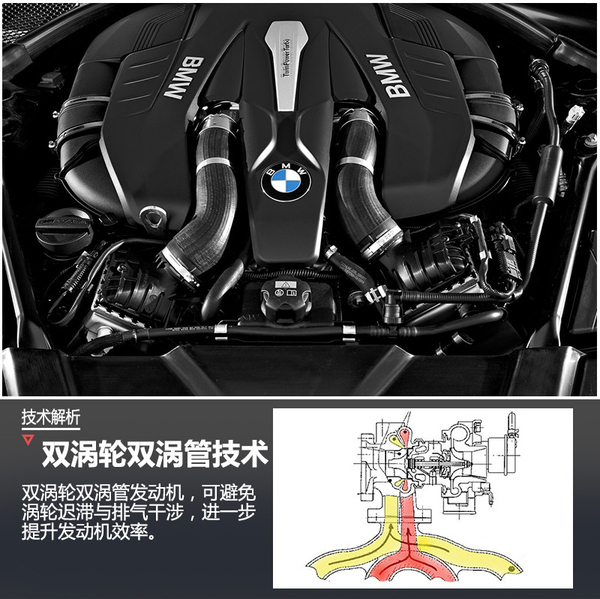 双涡轮双涡管技术则是为增强发动机扭矩输出而服务,宝马发动机配备两个轻质量小蜗轮,通过旁通阀来控制增压值。在低转速下旁通阀关闭保证足够的空气进入同时避免涡轮迟滞现象,而高转速下旁通阀开启实现恒定的增压值以优化燃油经济性。而双涡管可避免不同气缸排气时的气体脉冲干涉,让气缸可独立排气。该技术可尽量减小排气回压,保证排气的顺畅并提升发动机的工作效率。