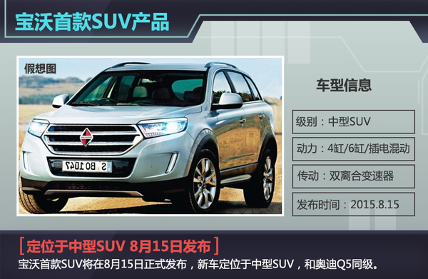 作为宝沃品牌回归后的首款全新产品,这款SUV车型将采用自行研发的发动机。据了解,大约有2000名技术人员参与了新车的项目,研发将花费几十亿的费用。在柴油版车型上新车有望搭载一款输出功率超过110kW的柴油发动机;而汽油版车型将会提供四缸和六缸两款汽油发动机供消费者选择。另外,随着新能源汽车的发展,宝沃旗下的这款具有历史意义的产品还将推出插电式混合动力版本。根据宝沃官方透露的消息,插电混动版车型在纯电模式下的最大续航里程达到了50km。此外,新车将搭载双离合变速箱并搭载四驱系统。