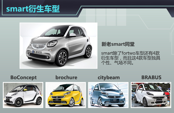 目前,老款smart衍生出了BoConcept、brochure、citybeam、BRABUS四个系列的产品,而全新smart暂时在中国市场上只推出了52千瓦硬顶灵动版和52千瓦硬顶激情版两款车型,smart的换代工作也将会持续到明年衍生车型全部引入到中国市场后才会结束。 smart除了给人小巧、灵活的印象外,节能、环保更是smart车型的标志,其中电动smart特别能代表这个品牌,具有绿色先锋的形象。不过全新 smart电动版车型还在研发中,期待明年smart衍生产品全部入华的时候能看到电动版车型的身影。