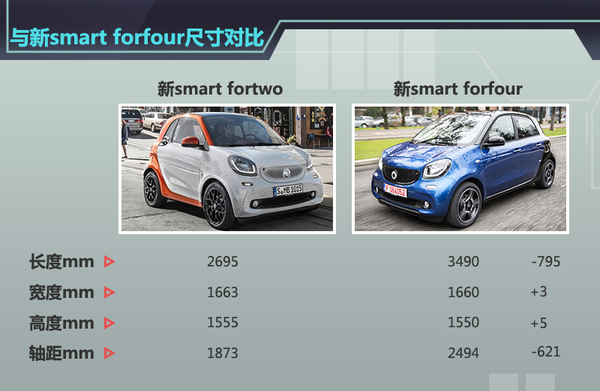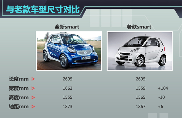 全新一代smart较比老款车型,在轴距和车身宽度方面都有不同的增长,在延续老款smart的灵活性上进一步增大了车内的空间。全新 smart将在明年引入搭载1.0T涡轮增压引擎的车型以及敞篷版和四门四座版到中国市场,值得一提的是,四门四座版smart的轴距比两门版本长 621mm达到2494mm,车身长度更是比两门版本长了795mm,成为现在的3490mm。而且4门版smart为了保证车身尺寸增大后的稳定性,在宽度和高度方面分别比老款减少了3mm和5mm,使4门版smart看上去更加协调,不会给人一种在两门版smart的基础上“拉皮”的感觉。