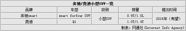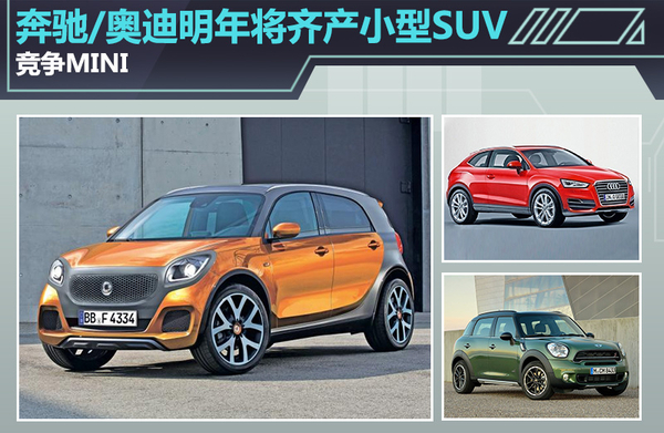 在“德系三强”的产品阵容当中,目前只有宝马旗下的MINI品牌推出了COUNTRYMAN这款定位于小型豪华SUV市场的产品。但随着小型SUV市场的日趋火热,COUNTRYMAN并不会“孤单”下去。近日,网通社在对近期消息进行汇总后发现,奔驰与奥迪两大品牌也将推出全新小型豪华SUV。据了解,奔驰旗下的全新小型SUV将出自smart品牌并基于全新一代smart forfour进行打造;而奥迪则将基于MQB平台打造全新小型SUV奥迪Q1。上述两款全新车型均有望在2016年正式推出,与MINI COUNTRYMAN进行竞争。