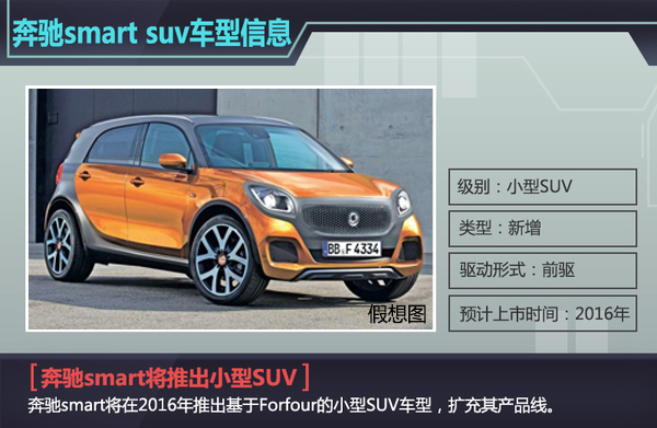 smart SUV将基于smart forfour进行打造,在后者的基础上进行车身的增高和加长。在外观造型设计上,新车会主打跨界路线,并拥有smart特征鲜明的时尚元素,比如双色车身设计等。另外在动力方面,与全新smart fortwo和forfour搭载的三缸发动机不同,smart SUV预计将采用四缸发动机,其最大输出功率有望达到109kW左右,以满足多功能车的动力需求。与此同时,在传动系统方面将采用双离合变速器,并有望提供全轮驱动版本。