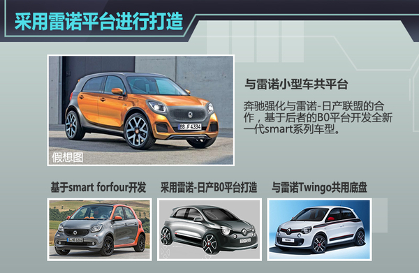 为了降低开发成本,奔驰强化与雷诺-日产联盟的合作,并基于后者的B0平台开发了全新一代smart系列车型。目前无论是fortwo还是forfour都采用了这种合作开发的形式,在此基础上,smart SUV也将同样基于雷诺-日产联盟开发的B0小型车平台进行生产,并与雷诺全新一代Twingo共享底盘。