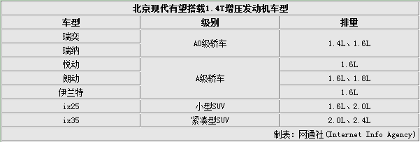 目前北京现代1.4T增压发动机的动力数据尚未公布,不过从其1.6T和2.0T发动机的动力表现推测,这款1.4T增压发动机动力输出有望超过1.8L自然吸气发动机。由于北京现代旗下瑞纳、朗动、ix25等6款车型目前搭载的是1.4L-1.8L排量的自然吸气发动机,因此这6款车型未来均有望改搭动力输出更为强劲的1.4T发动机。此外,北京现代紧凑型SUV ix35定位低于全新途胜,而全新途胜将搭载1.6T发动机,因此ix35未来有望搭载排量更小的1.4T增压发动机。
