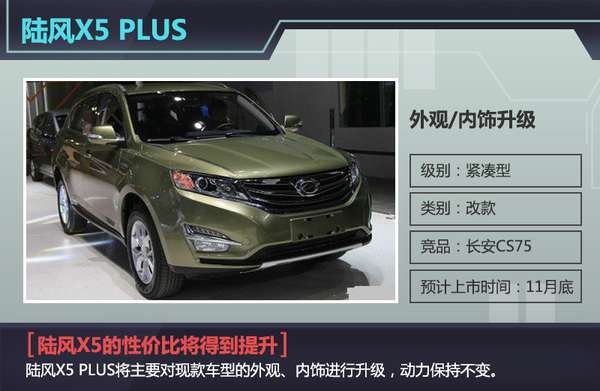 根据我们所掌握的情况,陆风在下一阶段将发布的第一款量产车型是X5 PLUS,该车主要针对现款车型的外观、内饰进行升级,其中要数车头处的变化较大,三辐式镀铬进气格栅形状更加舒展,应用全新造型的雾灯与新增加的LED日间行车灯一起,增强了该车的整体时尚感。内饰部分,经过重新优化的多功能方向盘和中控台操作面板明显“硬朗”了不少,同时不失原有质感。