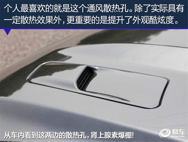 这个细节是我最喜欢的地方,前机器盖上的通风口表达了它的性能,同时隆起的设计让你在车内也能看到,时时刻刻给人一种肾上腺素爆发想要猛踩油门加速的冲动。不过交通规则您还得遵守。