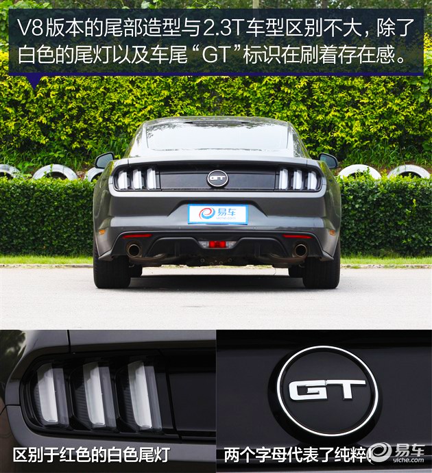 总的来说,5.0L版本与2.3T版本外观并没有差太多,毕竟是相同的车型。不过福特十分聪明,因为你无论从哪个角度看,都能一眼看出它是一辆5.0L GT版本的车型,车前的进气格栅与机器盖通风口,车尾的白色尾灯与GT标识,以及车侧硕大的“5.0”车标,都能彰显它的身份,你说它低调吧,却又流露出骨子里的嚣张,这就是美系跑车魂之所在,就是这么自信,不凭借浮夸的线条表现自己!