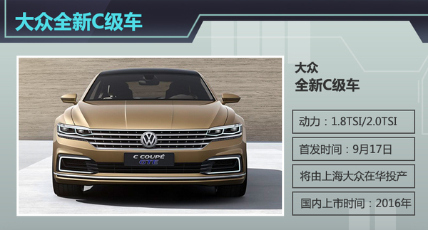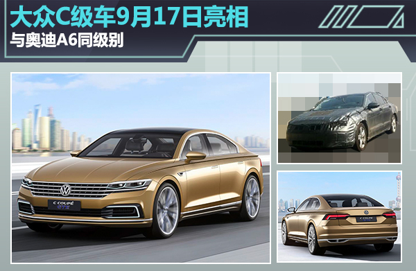 此前大众正式发布了旗下与奥迪A6同定位在C级轿车市场的概念产品C COUPE GTE,而根据之前大众集团的规划,这款为中国市场开发的全新车型将在上海大众投产。近日网通社了解到,上海大众全新C级车的量产版有望最快在今年9月17日开幕的德国法兰克福车展上正式亮相。关于在华的上市时间,上海大众汽车有限公司销售与市场执行副总经理、上海上汽大众汽车销售有限公司总经理贾鸣镝先生也曾表示:全新开发的C级车将定位在帕萨特和进口辉腾之间,全面拉升上海大众在中国的品牌形象,并将于2016年正式上市。