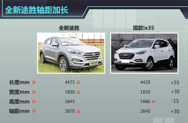 全新途胜为现款ix35的换代车型,但是新车定位高于ix35低于全新胜达,相比于ix35而言,全新途胜车身尺寸得到升级,新车车身长度和宽度分别增加55、30mm,轴距加长30mm,新车内部乘坐空间大幅增加,此外,全新途胜高度降低15mm,新车将给人一种更为沉稳的感觉。值得一提的是,全新途胜的轴距长度与东风本田CR-V等同级别车型相比也非常具有竞争力。