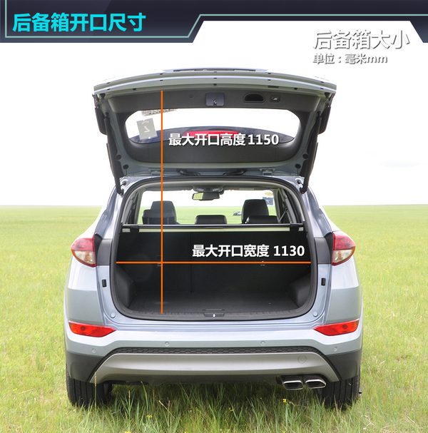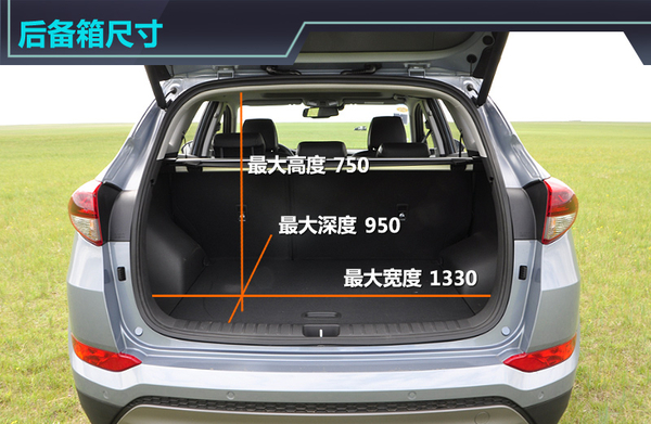 在了解了驾乘空间的状态之后,让我们再来看看北京现代全新途胜的后备箱空间。打开后备箱后笔者的第一感觉是——很深、很高,该车后备箱的最大深度达到了950mm,而750mm的高度对于大件物品的取放非常方便,新车的后备箱空间在同级别车型中较有优势。此外,新车后备箱的最大开口高度为1150mm,最大开口宽度则达到了1130mm。