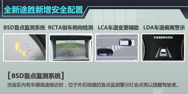 在安全配置方面,全新途胜表现可圈可点,新车新增BSD盲点监测系统、RCTA倒车侧向检测、LCA车道变更辅助以及LDA车道偏离警示等多项配置,安全性能得到大幅提升。给笔者留下较深印象的是BSD盲点监测系统,当盲区内有车辆高速接近时,位于外后视镜的盲点监测警示灯会点亮,提醒驾驶者注意盲区来车,确保了行车安全。而LDA车道偏离警示系统也非常实用,当车道发生偏离时,位于仪表盘中部的行车电脑会显示偏离信息,并发出警报提醒驾驶者。值得一提的是,全新途胜车身超高强度钢材的使用比例高达51%,该车在美国NHTSA碰撞测试中更是获得了5星评价。