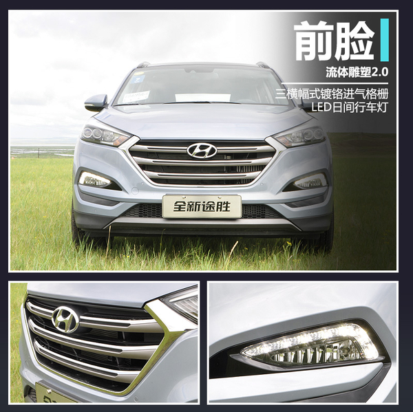 “流体雕塑2.0”设计理念在全新途胜身上得到充分的体现,新车大量应用平直线体及扁平化设计,体现了硬朗、运动的形象,极具家族特征的三横幅镀铬进气格栅使得全新途胜前脸造型霸气十足。新车LED前大灯采用开眼式设计,辅之以亮银色的LED灯眉,使得新车时尚感大幅提升。