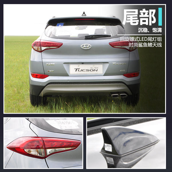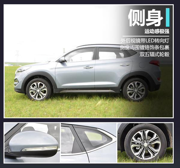 全新途胜侧身采用俯冲式的腰线、黑色的轮眉、以及碳纤维装饰双五辐式轮毂,使得新车运动感得到提升,此外,全新途胜尾部的双排气管设计也在强调它的运动气质。LED尾灯设计更给整车添加了些许刚中带柔的效果,显得恰到好处。值得一提的是,全新途胜的风阻系数只有0.33,在同级别车型中非常具有竞争力。