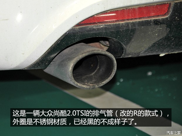 遇到问题的车是一辆大众尚酷2.0 TSI,排气管改成尚酷R的双边共两出款式,更帅气的双椭圆排气管,不过脏了以后看着就太不精神了,注意,文章中擦拭的排气管带有是不锈钢套管设计的。