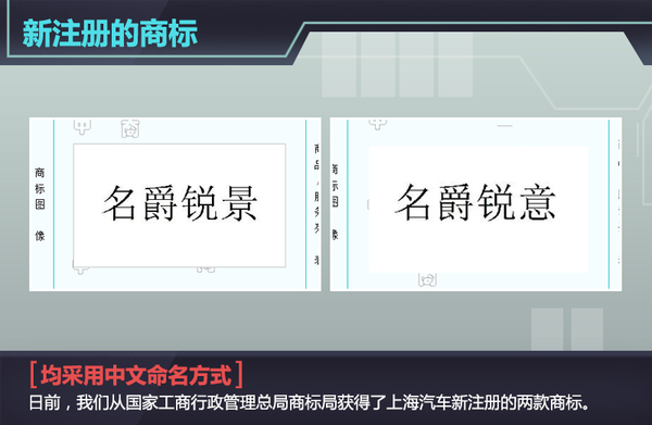 自名爵锐腾开始,MG品牌旗下的产品便逐步将原本数字或字母的命名方式改为了更利于传播的中文。如今,这样的做法也将得以延续。网通社从国家工商行政管理总局商标局获悉,上汽名爵新注册了两款“锐”系列的商标,分别是名爵锐景和名爵锐意,其有望应用于名爵后续推出的两款新车上。