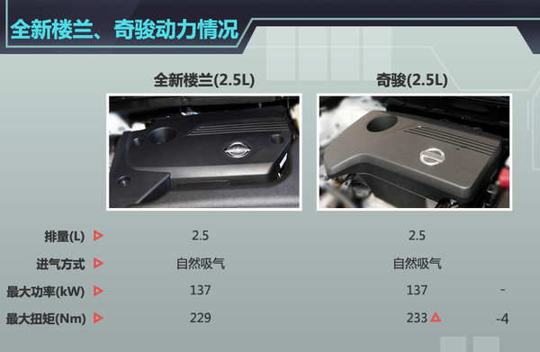 动力方面,全新楼兰与奇骏共享型号为QR25的2.5L自然吸气发动机,但二者经过不同调校,最大功率同为137kW、最大扭矩方面全新楼兰与奇骏相比相差4Nm,总体而言这款发动机动力输出较为卓越,对于整备质量分别为1652kg的全新楼兰2.5 XE 精英版和1564kg的奇骏2.5 XL ITS 豪华版而言,这款发动机足够用。