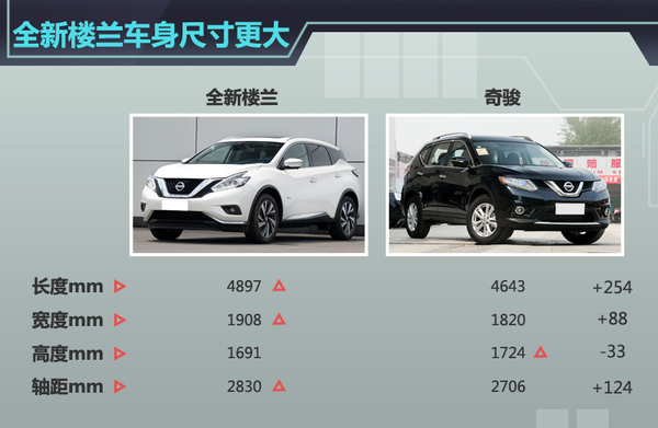 在车身尺寸方面,中型SUV全新楼兰与紧凑型SUV奇骏相比优势明显,全新楼兰在车身长度和宽度方面分别超出奇骏254和88mm,轴距比奇骏长出124mm,并且二者都采用2排5座座椅布局,因此全新楼兰在乘坐空间方面会更为宽敞,此外全新楼兰车身高度相比奇骏降低33mm,新车给人的感觉将更为稳重。